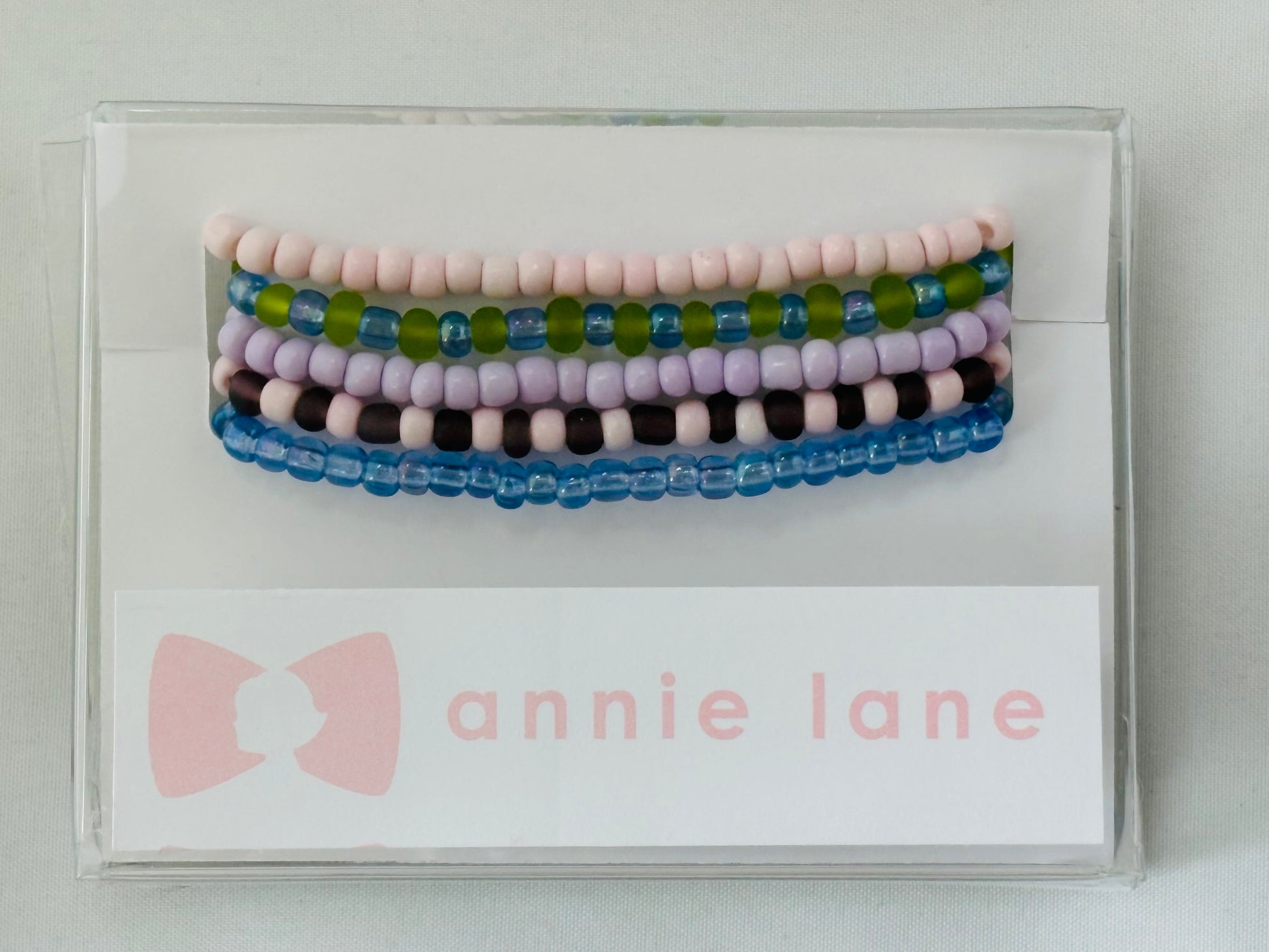 A fun and bright set of five beaded bracelets! Assorted beads are strung on thick elastic.